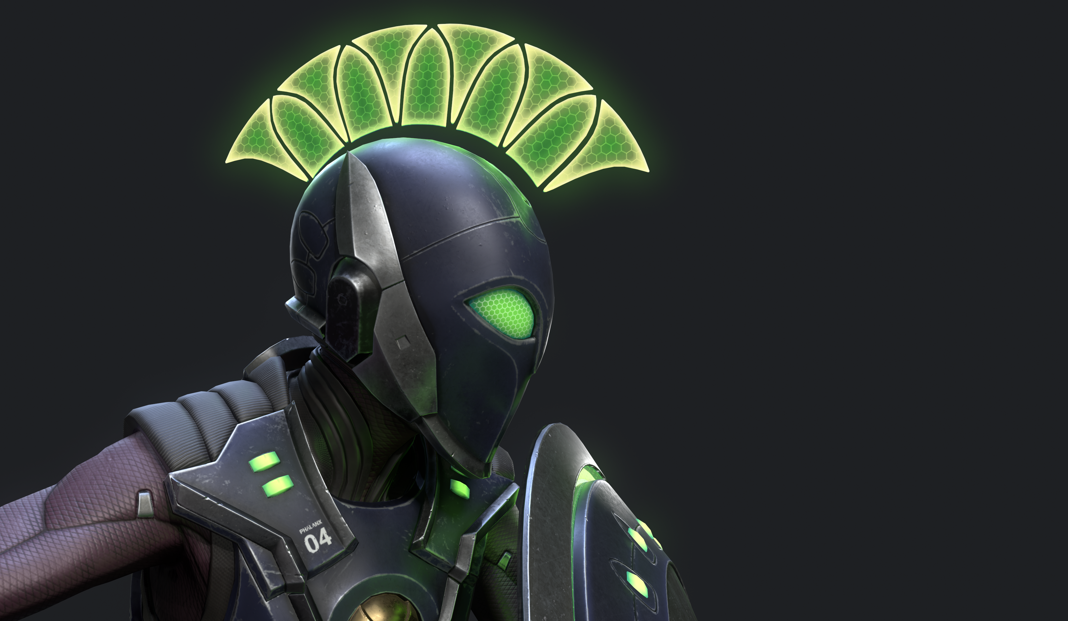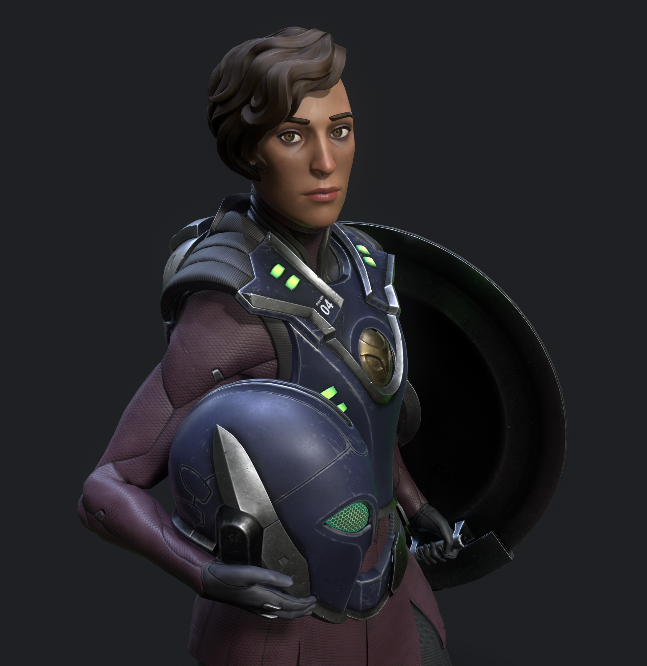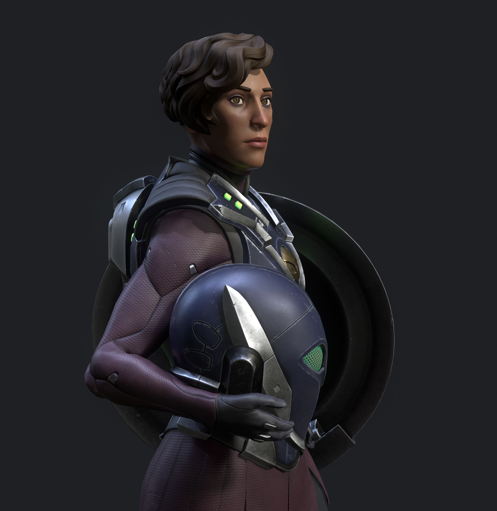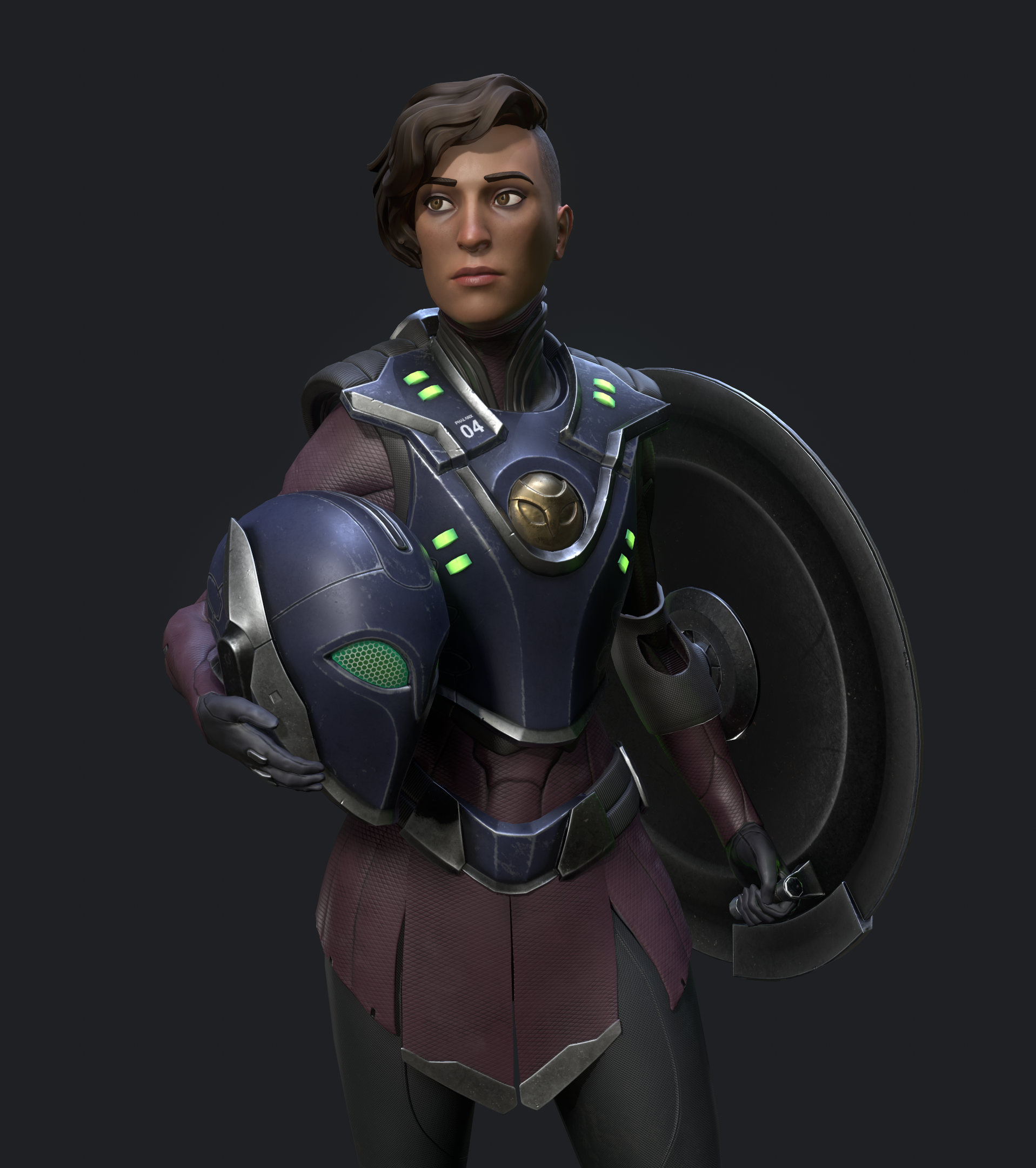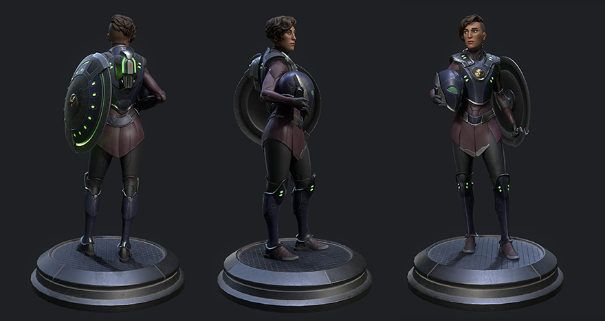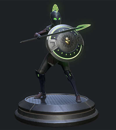 Personal project based on my own concept. I started with some sketches of a sleek sci-fi hoplite and a rough sculpt in ZBrush. The design evolved a lot before I landed on her final look. I used Maya and ZBrush for modeling, Substance Painter for texturing, Marmoset Toolbag for rendering, and Photoshop for odds and ends along the way. Special thanks to Paulo Santana, Farid Sandoval, and MaryAnn Kowalski for their insightful feedback and critiques along the way.